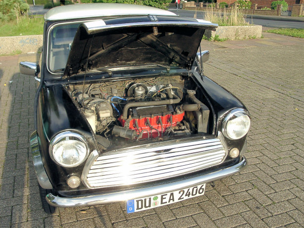 Der Vorbesitzer hat den Mini getuned, d.h. Bastuck-Sportauspuff, LCB-Krümmer, K+N-Luftfilter, Ansaugbrücke und Düsennadel sind getauscht worden, sowie ein Holzlenkrad. Für den Bastuck-Auspuff liegt eine ABE bei, ich habe einen Silencer eingebaut weil er mir zu laut war, er klingt aber immer noch sehr sportlich-kernig. Ich war vor ein paar Monaten auch auf dem Prüfstand und statt 42 PS hat er 48.2 PS, er geht vor allen Dingen in den Kurven ab wie ein Go-Kart.