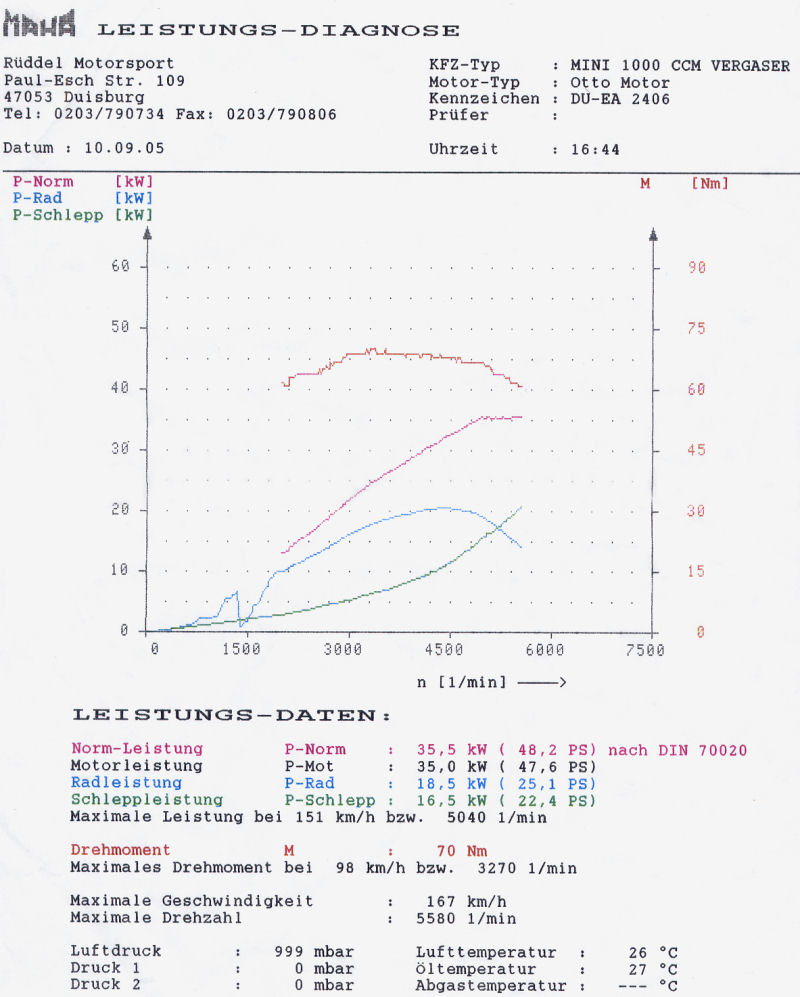 Leistung: 48,2 PS bei 5040 U/min. (ohne Tuning 42 PS), Leistungsdiagramm hier