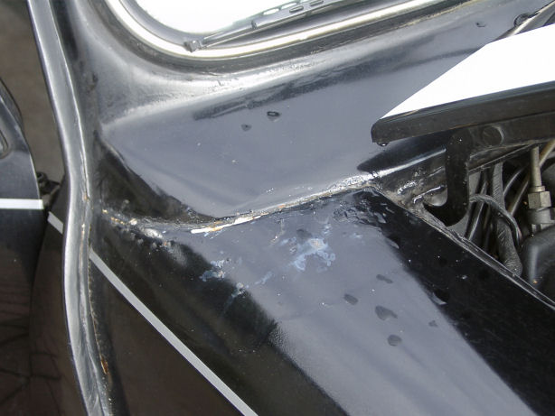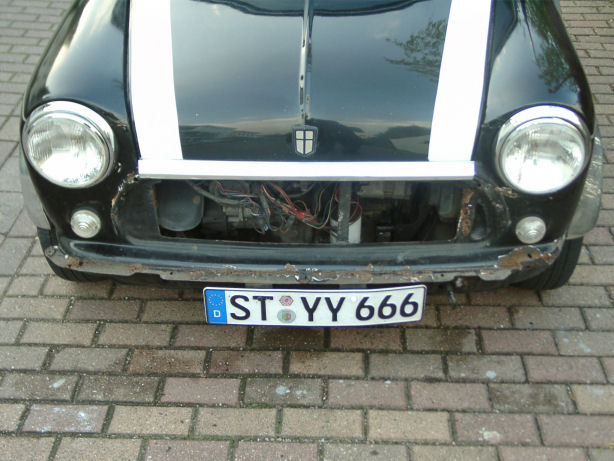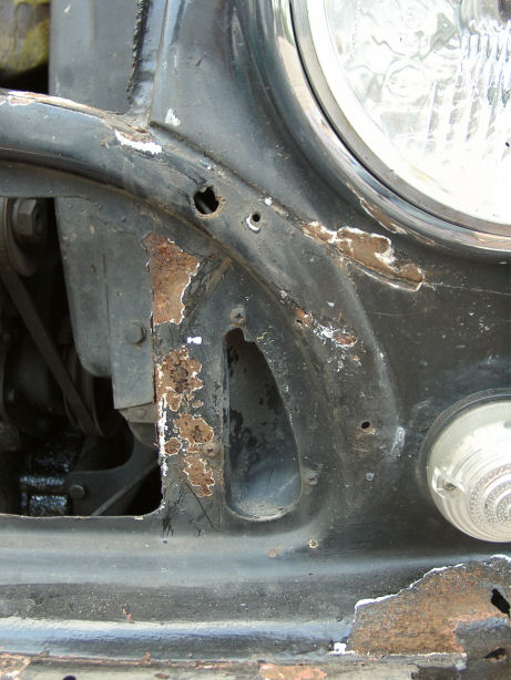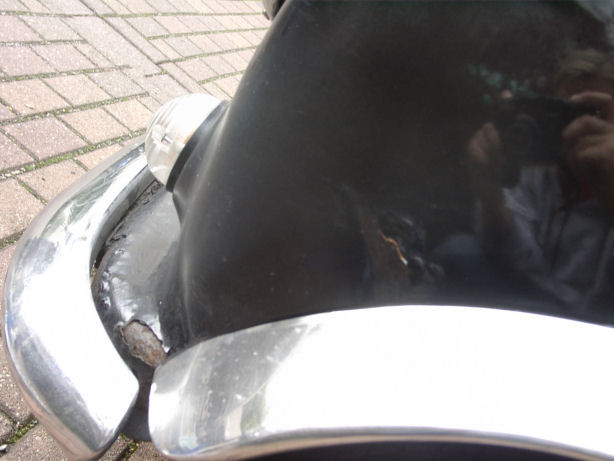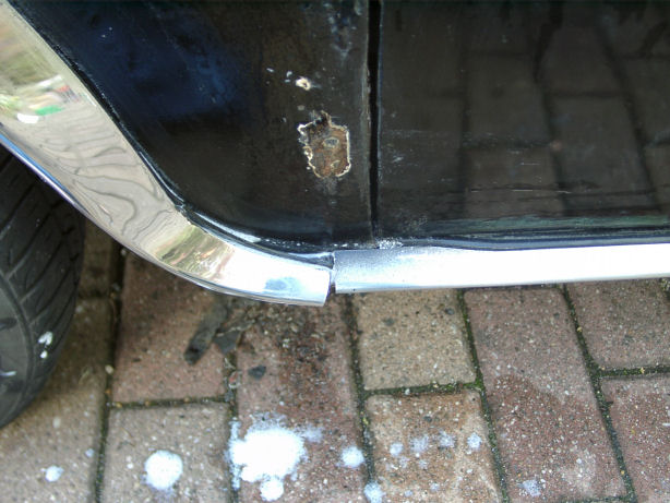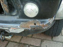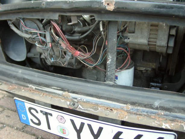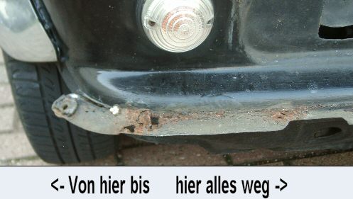 An der Front war es hinter dem Chromkühlergrill besonders extrem, so viel, daß wir die Lippe zur Befestigung der Stoßstange teilweise abbrechen konnte (siehe von hier bis hier alles weg)
